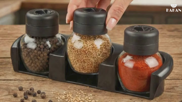 3-Pack Glass Seasoning Shaker Set has an included organizer rack for easy storage and access. Each shaker is made from durable, clear glass, allowing you to quickly identify contents at a glance, while the adjustable black plastic lids offer multiple pour settings for precise seasoning control.