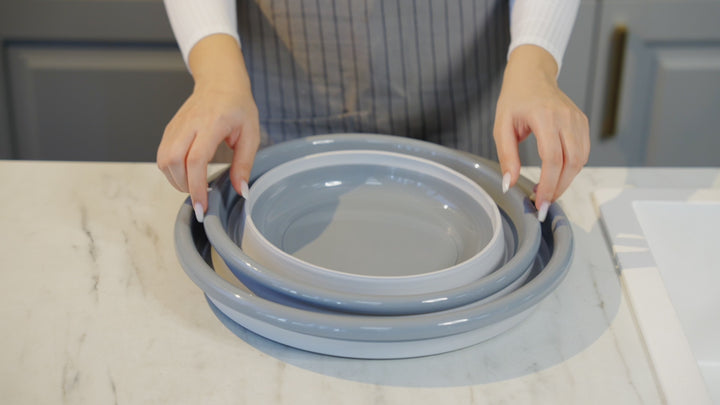 The 2-Piece Collapsible Round Basin Set is a practical solution designed to make everyday kitchen tasks easier. Featuring a modern gray color and a space-saving collapsible design, this set is ideal for versatile use and convenient storage.