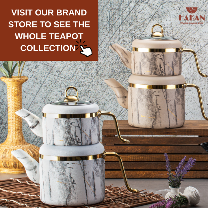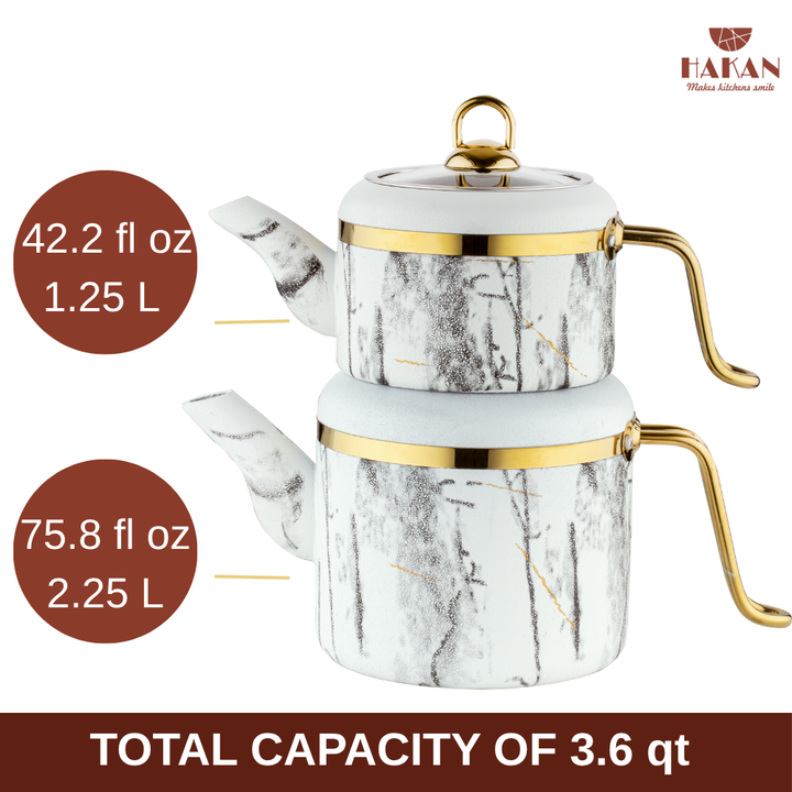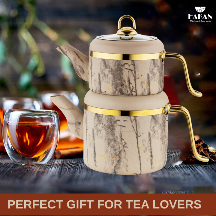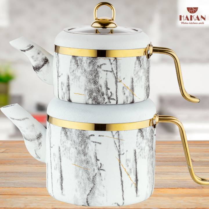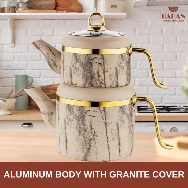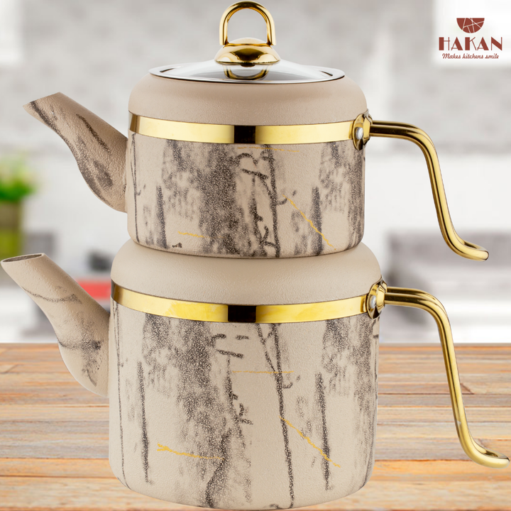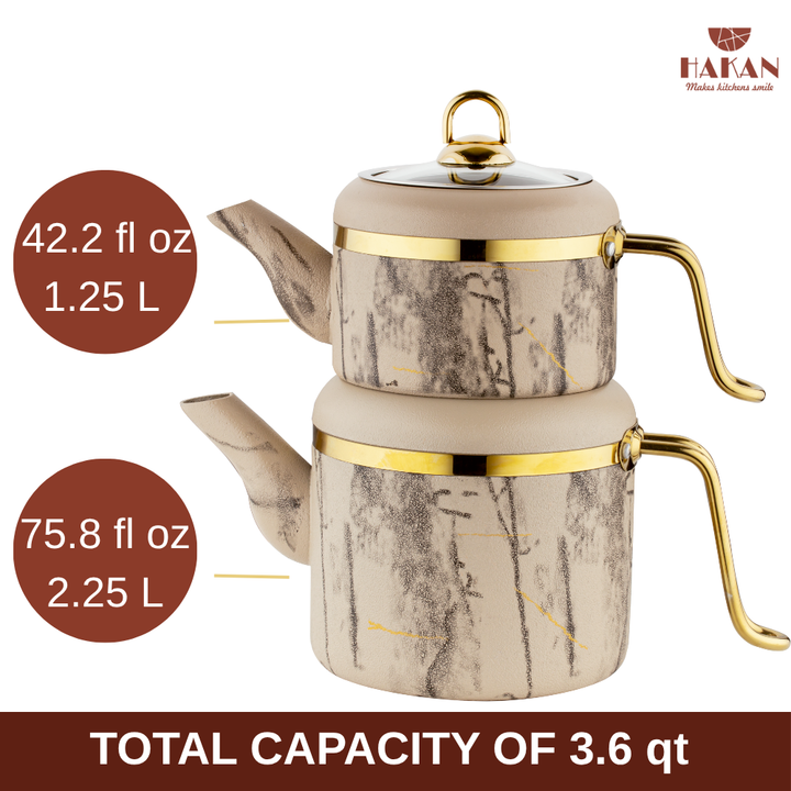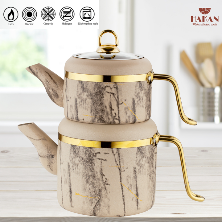 Hakan Melody Double Turkish Teapot Set combines traditional design with modern elegance, offering an authentic way to brew and serve tea. Crafted with a durable yet lightweight aluminum body, it ensures even heat distribution for perfectly steeped tea every time. The elegant granite coating adds a stylish touch to your kitchen while providing easy cleaning and scratch resistance. Featuring stainless-steel handles for a comfortable, cool grip and a clear glass lid for easy monitoring, this teapot set is as practical as it is beautiful. The upper pot (1.25 L) is ideal for brewing concentrated tea, while the bottom kettle (2.25 L) keeps hot water ready for mixing to your preferred strength, offering a total capacity of 3.6 quarts—perfect for families or guests. Compatible with gas, electric, and ceramic stovetops, the Melody Teapot Set brings the warmth and tradition of Turkish tea culture to your home with a modern, refined finish.