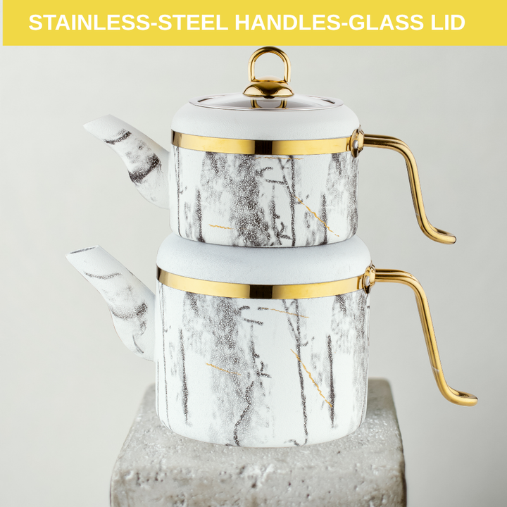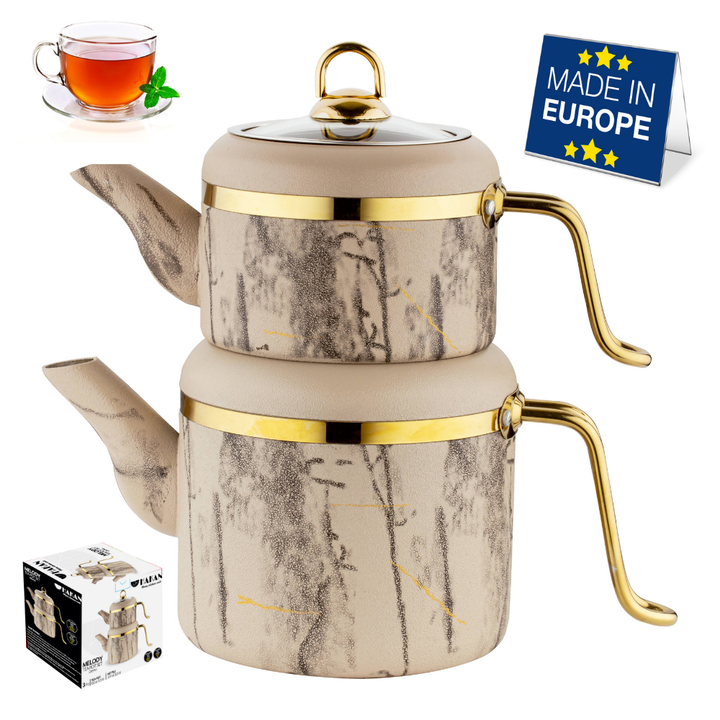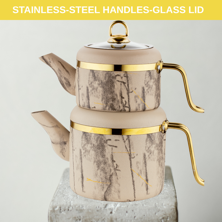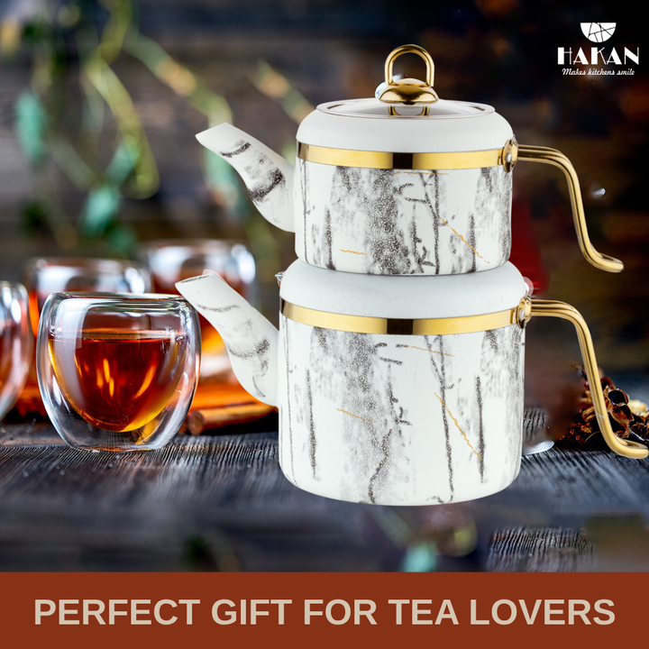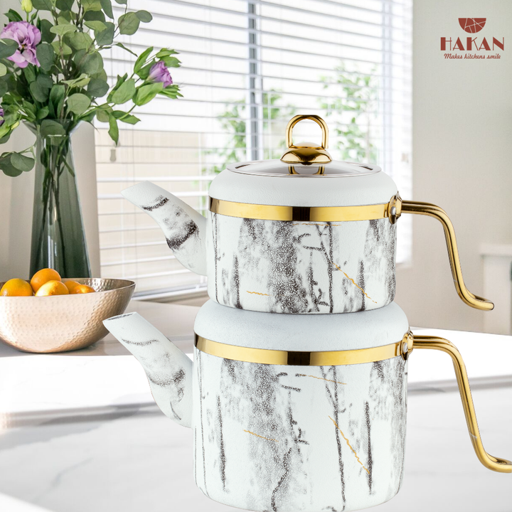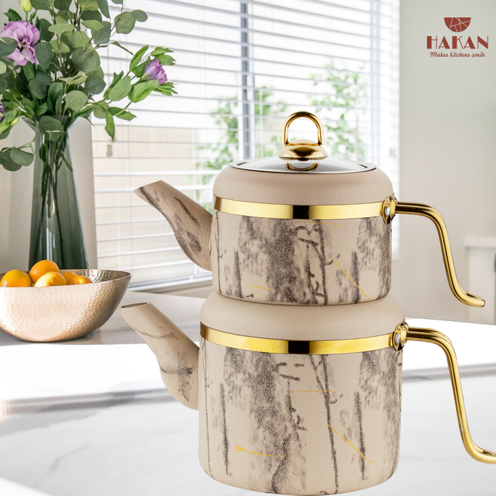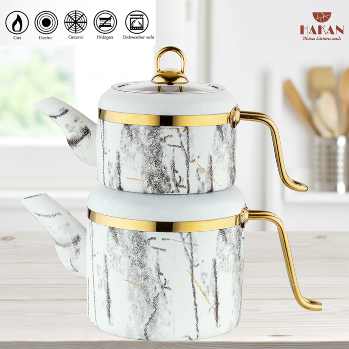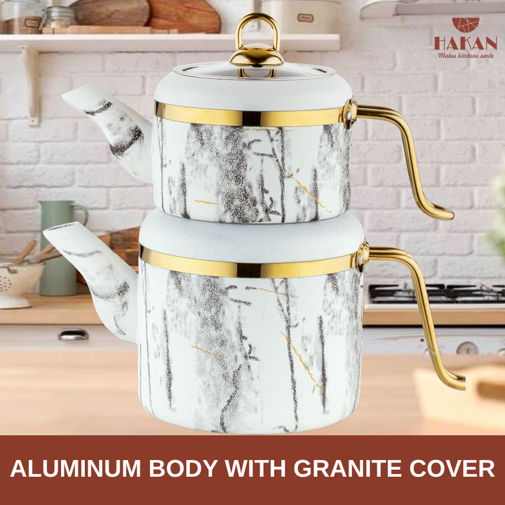 Hakan Melody Double Turkish Teapot Set combines traditional design with modern elegance, offering an authentic way to brew and serve tea. Crafted with a durable yet lightweight aluminum body, it ensures even heat distribution for perfectly steeped tea every time. The elegant granite coating adds a stylish touch to your kitchen while providing easy cleaning and scratch resistance. Featuring stainless-steel handles for a comfortable, cool grip and a clear glass lid for easy monitoring, this teapot set is as practical as it is beautiful. The upper pot (1.25 L) is ideal for brewing concentrated tea, while the bottom kettle (2.25 L) keeps hot water ready for mixing to your preferred strength, offering a total capacity of 3.6 quarts—perfect for families or guests. Compatible with gas, electric, and ceramic stovetops, the Melody Teapot Set brings the warmth and tradition of Turkish tea culture to your home with a modern, refined finish.