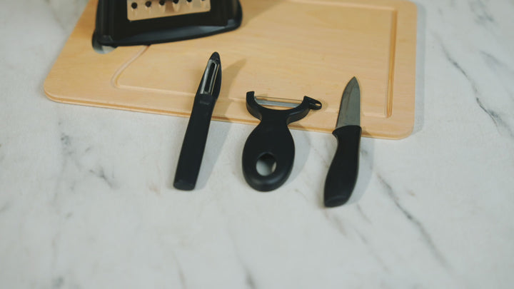 The Grater, Chop and Peel Set of 4 is a versatile kitchen utensil set. The multipurpose set is designed to simplify everyday food preparation. This multi-functional set includes a 3-sided handheld grater with different shredding sizes (coarse, medium and fine), a sharp Y-shaped vegetable peeler, a I-shaped food slicer, and a spear-style knife for detailed cutting tasks. The grater allows you to easily shred cheese, vegetables, and fruits using three different blade sizes in one compact tool. Each side of the grater is made with high-quality stainless-steel blades for long-lasting sharpness and efficient performance. The ergonomic handles of the items ensure a secure grip, making chopping, peeling, and slicing safer and more comfortable. Each gadget is ideal for home cooks, meal prep, and daily kitchen use. This chop and peel kitchen tool set is easy to clean, space-saving, and a practical addition to any kitchen.